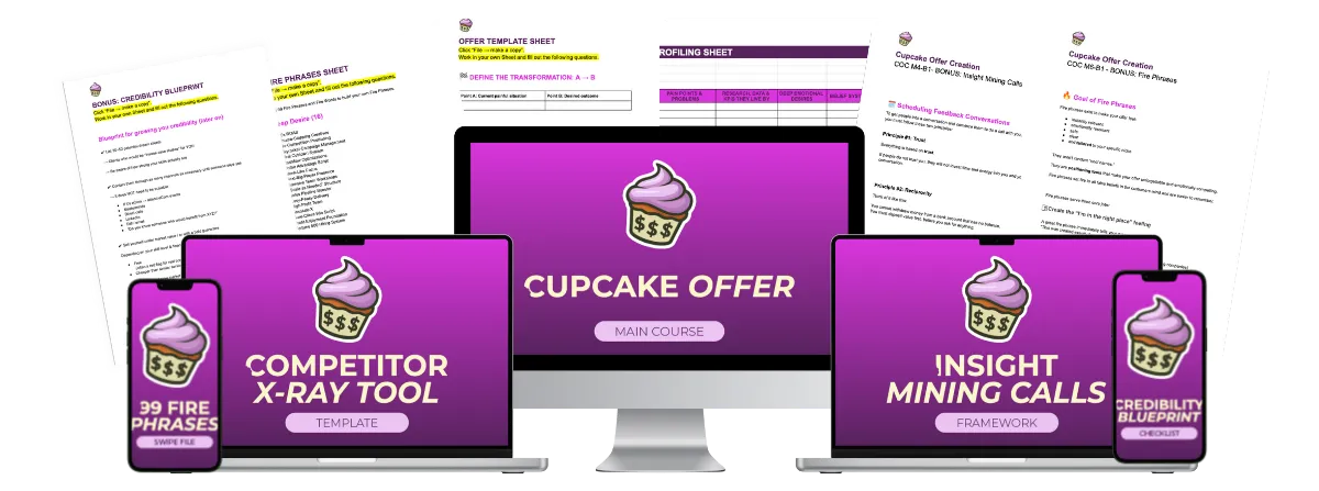 You get the full Cupcake Offer Engineering System — plus 4 profit-boosting bonuses, including: Competitor X-Ray, The Credibility Blueprint, 99 Fire Phrases Swipe File, Insight Mining Call Framework.